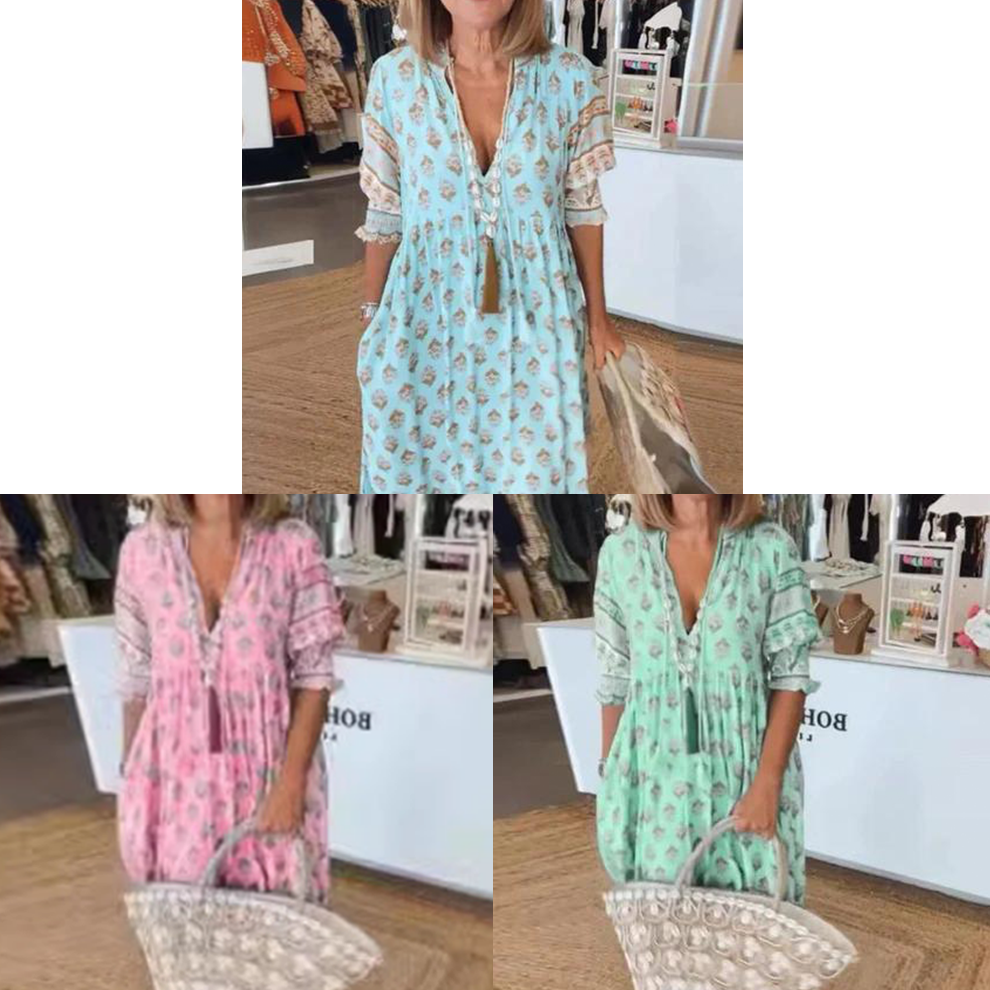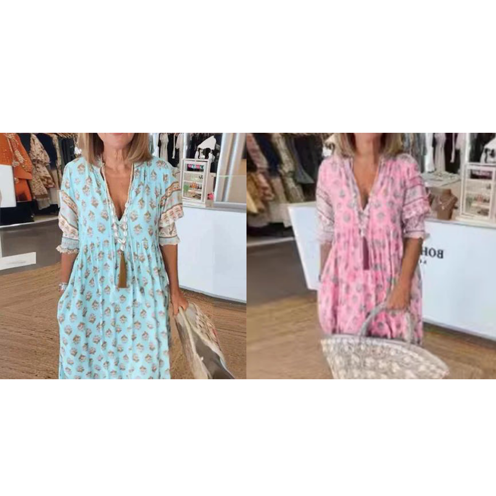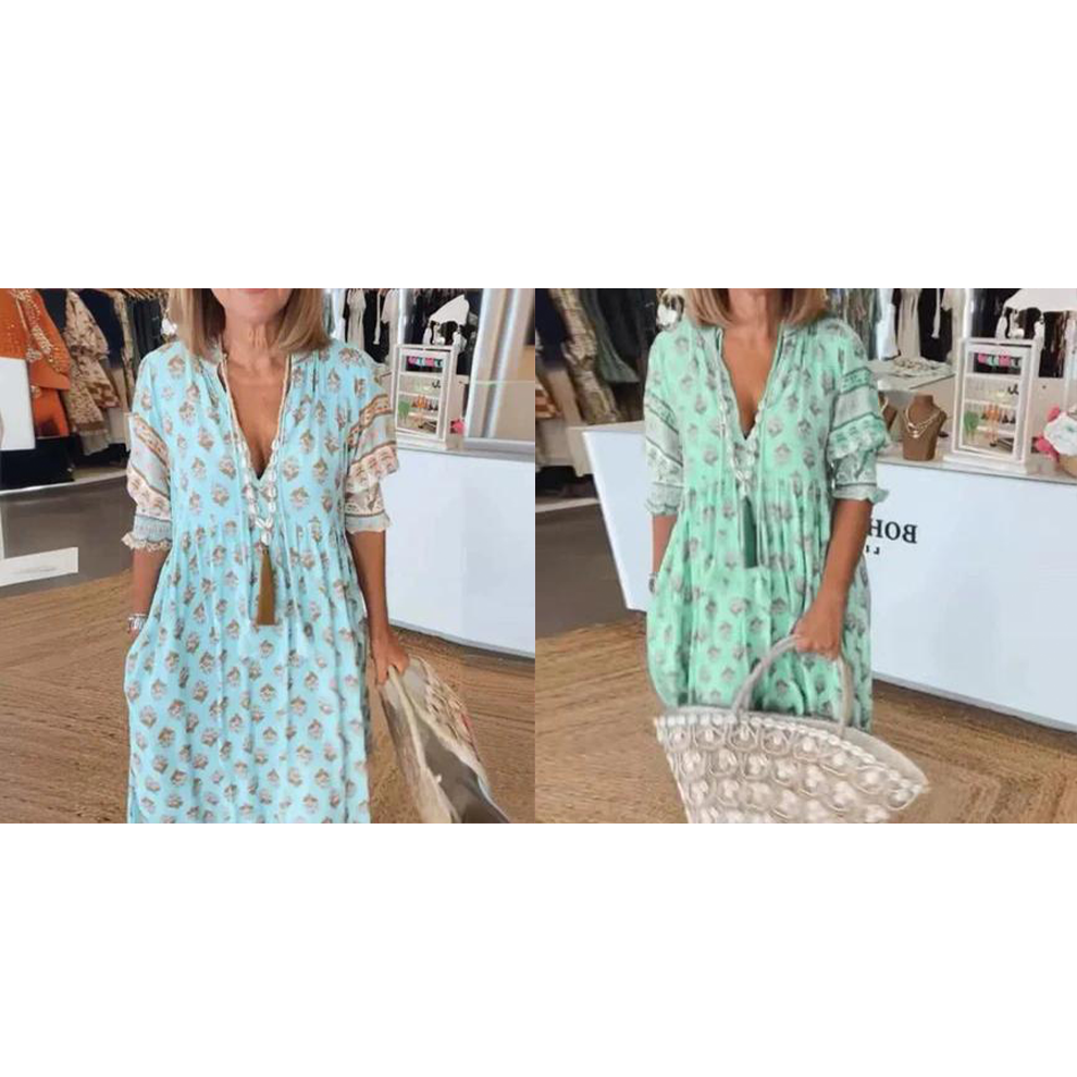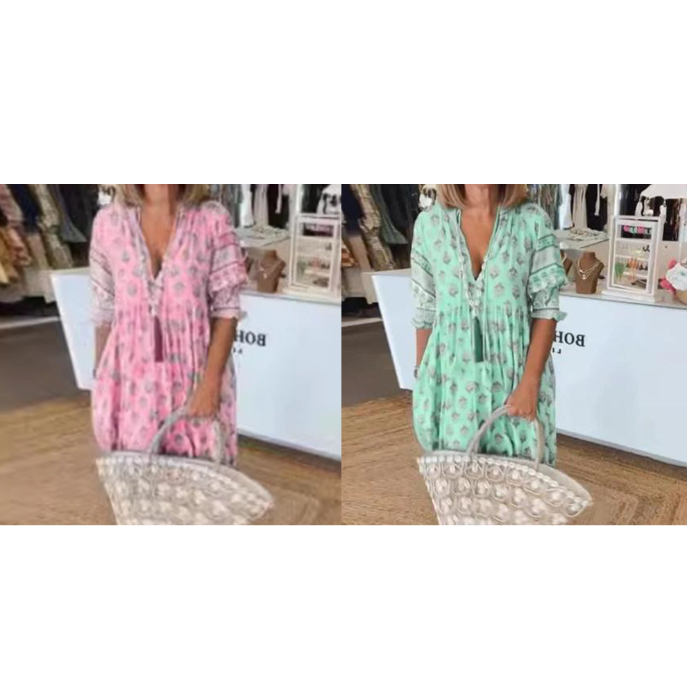 🌼 Fresh & flirty! The Casual Printed Dress with V-neck and half-length sleeves is perfect for any day out. Style and comfort meet in one stunning dress! 👗💖