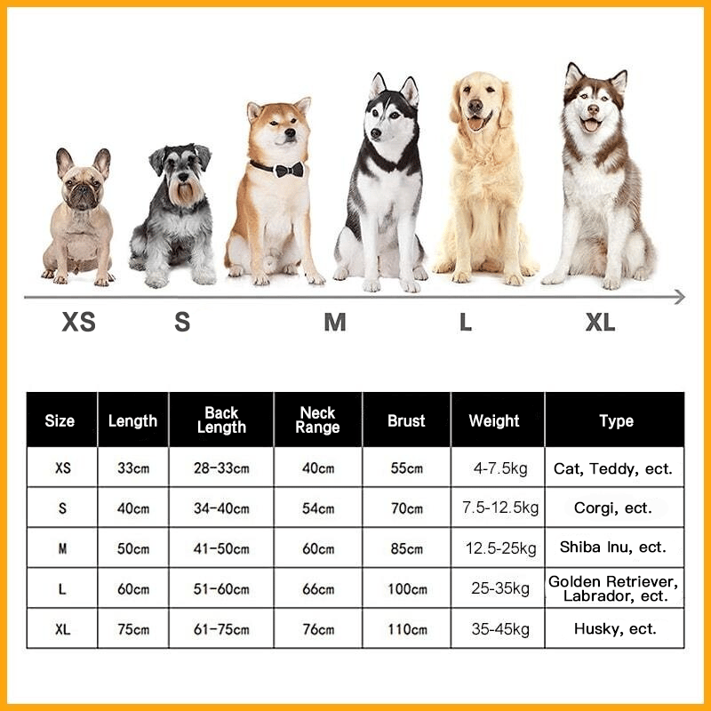 Available in 5 sizes from XS to XL, it fits small, medium and large dogs and cats. The round chest and neck are adjustable for better coverage of the pet's body.