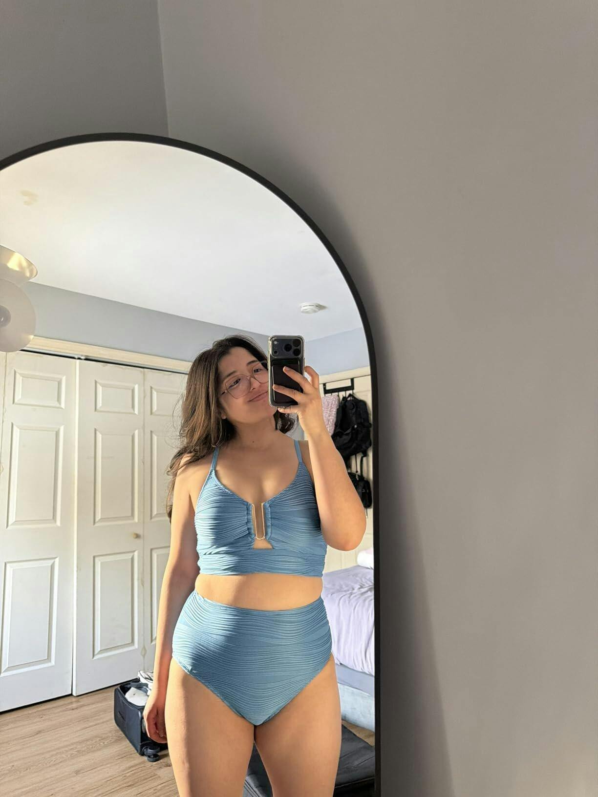 What a STEAL!!!! For my butter yellow girlies, this is a must. I bought a size medium and it fit me very nicely without being too tight. I like a higher waisted bikini bottom and it sat perfectly where I would expect it to. The pattern design is so cute. And the gold accent piece is a nice touch. I didn’t know that the bra straps cross in the back, but it wasn’t uncomfortable at all. The bra has quality padding. I wore this all day to the beach and it was comfortable all day long!!