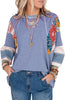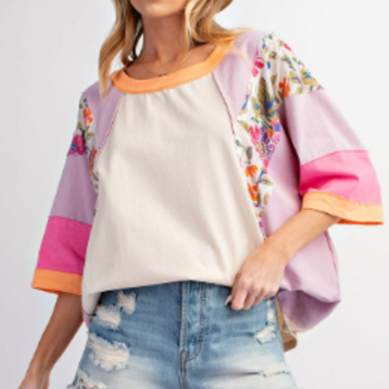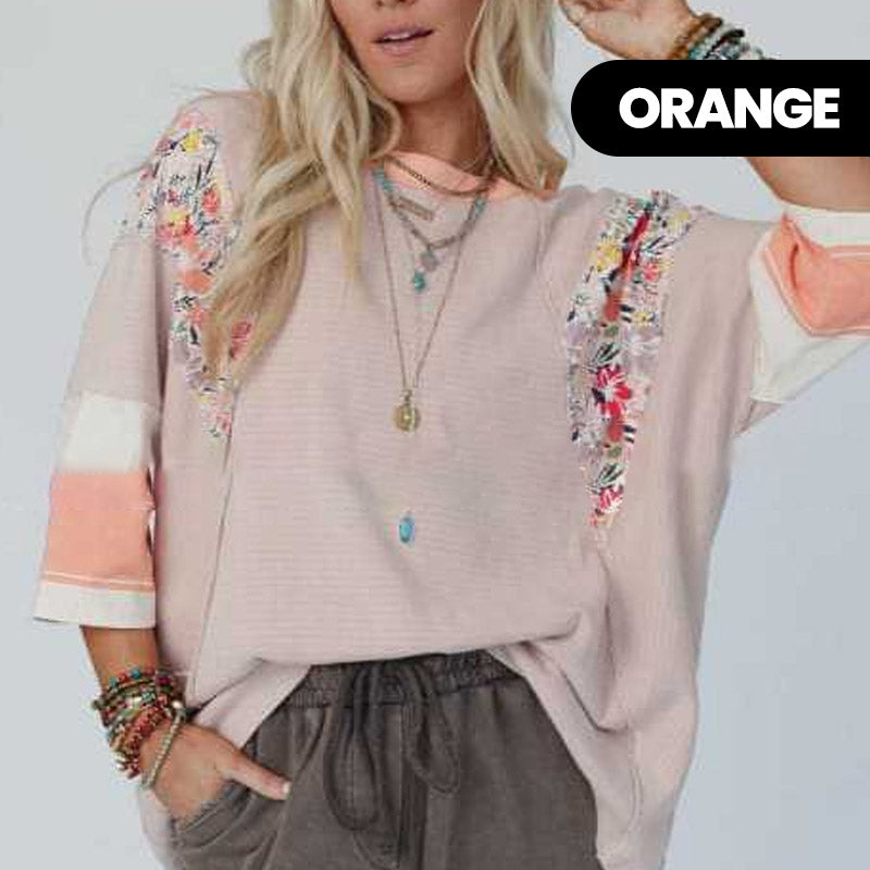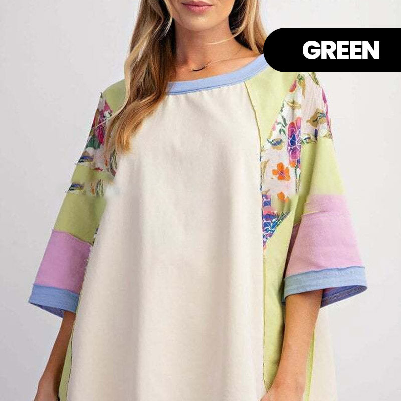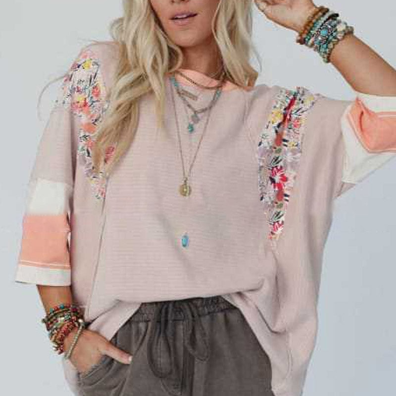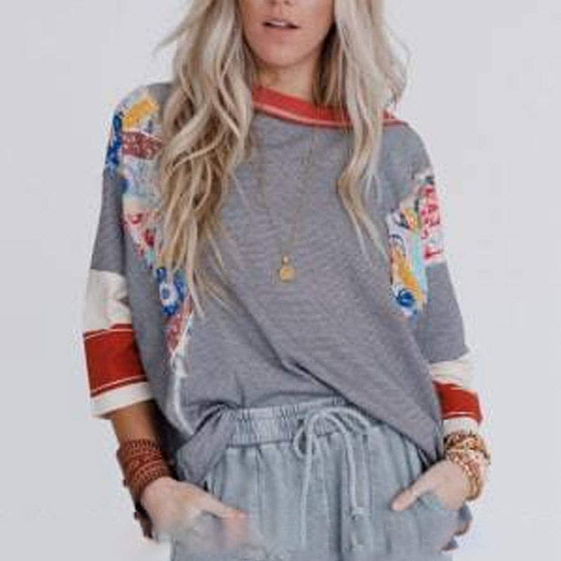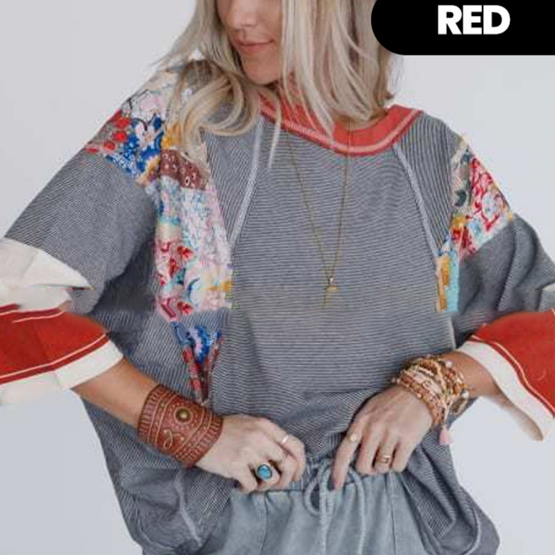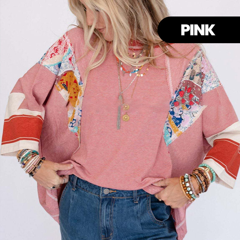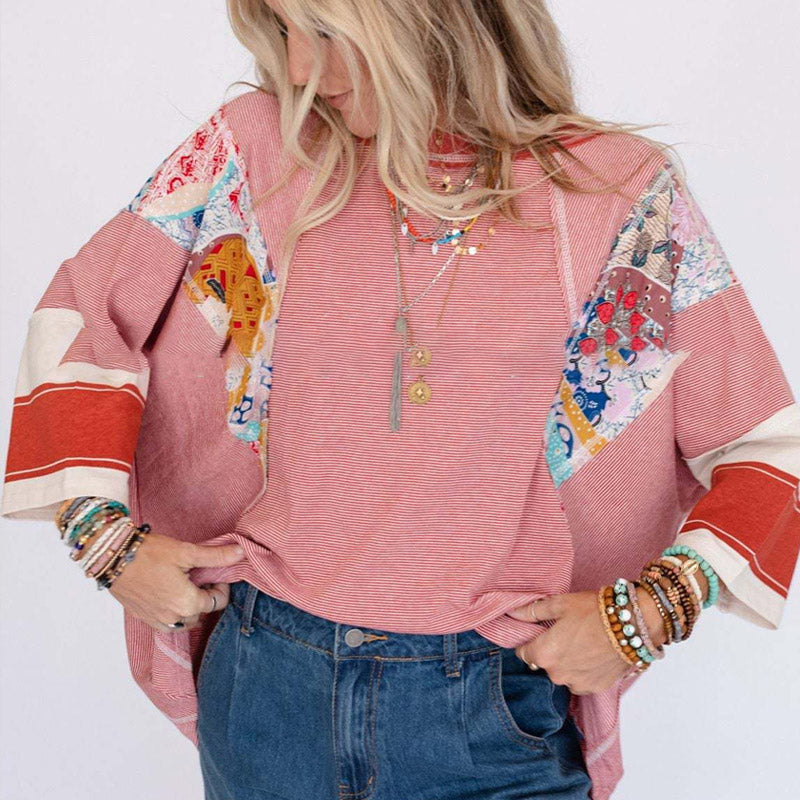 Featuring a crewneck and 3/4 batwing sleeves with chic patchwork design, this blouse offers a raw edge and boho style for a loose, flattering fit. The striped fabric ensures comfort while adding sophistication to any outfit. Patchwork detailing on the sleeves adds a feminine touch. Perfect for an elegant look!