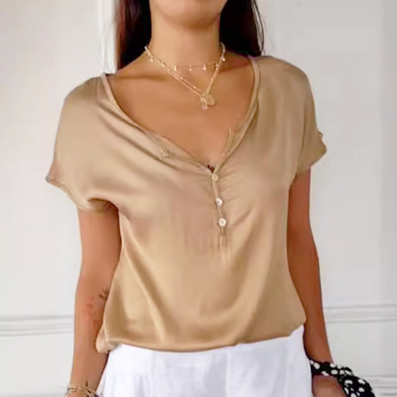 - IMPRESSIV V-NECKLINE DESIGN - Accentuate your neckline with our V-Neck Satin Plain Short Sleeve T-Shirt. The classic V-neck design creates a flattering silhouette that accentuates your natural curves and elongates your neckline.