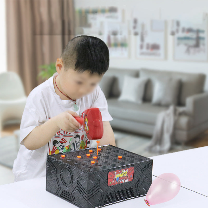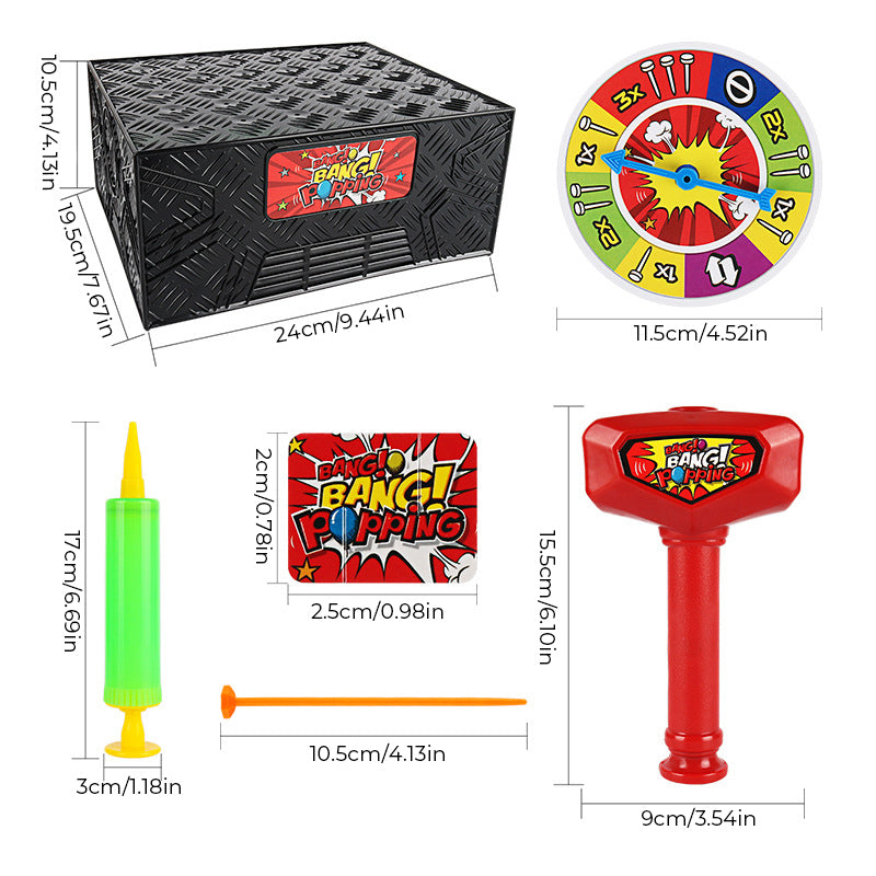 Inflate one of the balloons (100 included) and place it under the Wack-A Balloon box! Take the Wack!! Hammer and the nails provided. Spin the spinner that's included.